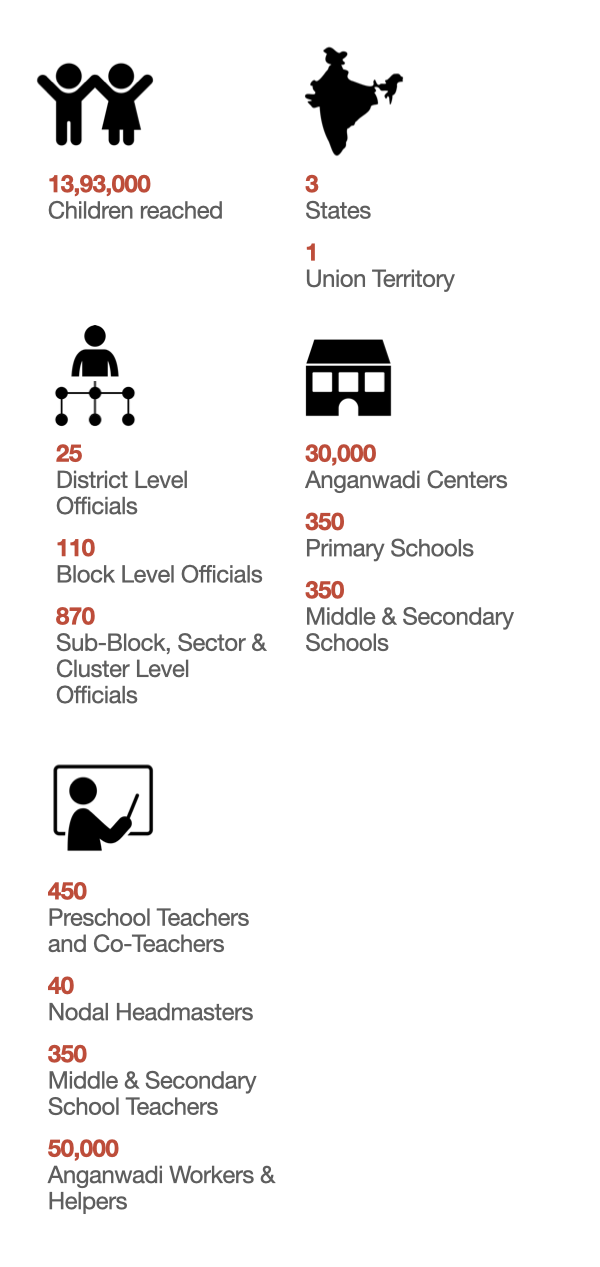 FCL’s work reaches lakhs of children in multiple states in India. Such large-scale impact is achieved by building pedagogical and organisational leadership capacities at multiple levels across large government systems of child development and education. This helps the officers and frontline workers/ teachers facilitate their teams in delivering nurturing care and learning with meaning to the children in their care. Not only does this provide a richer learning and development environment to the children currently in these Anganwadis and schools, the presence of motivated and skilled facilitators within the system ensures sustainability and that future generations of children that pass through these systems will continue to receive the care and education that can help them thrive.