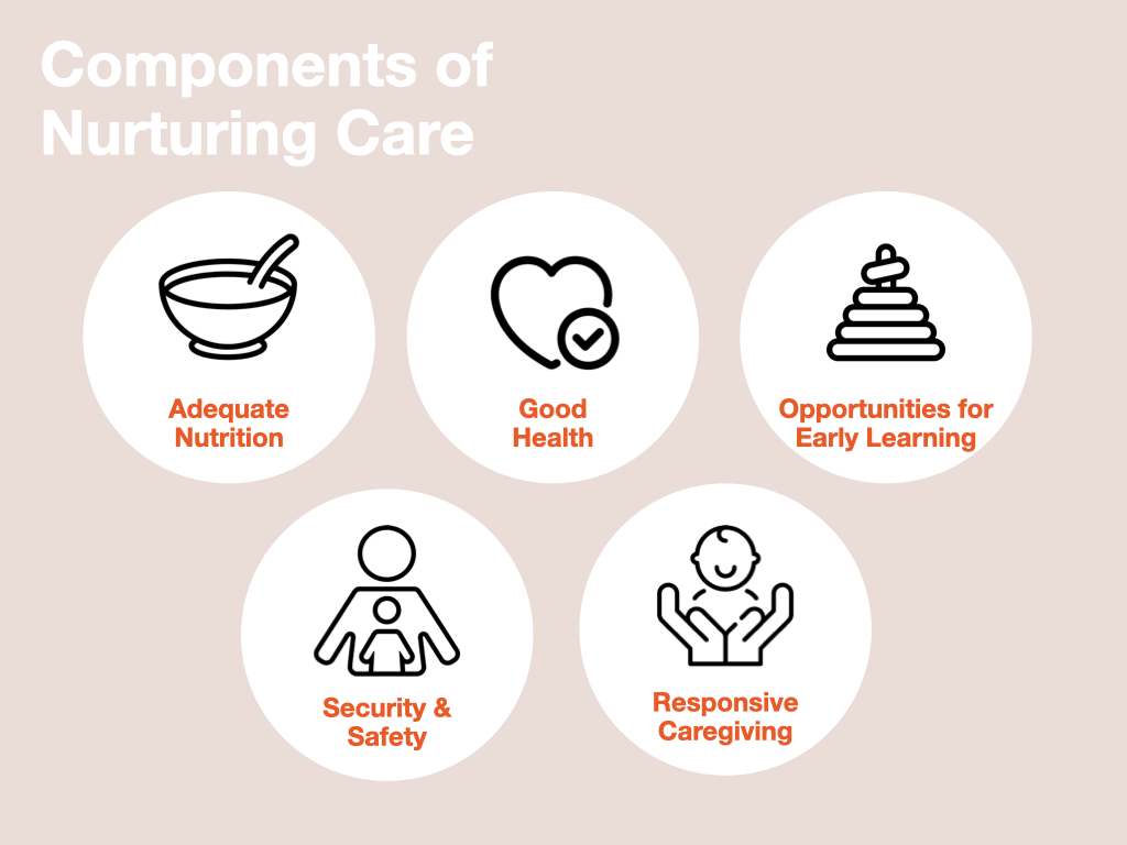 Nurturing care means that children experience good health, adequate nutrition, a sense of physical and emotional safety, responsive caregiving and ample opportunities for exploration and learning. (Ref: WHO, UNICEF, World Bank Group. Nurturing care for early childhood development: a framework for helping children survive and thrive to transform health and human potential, 2018). There is global agreement that Nurturing Care is critical for early childhood development.